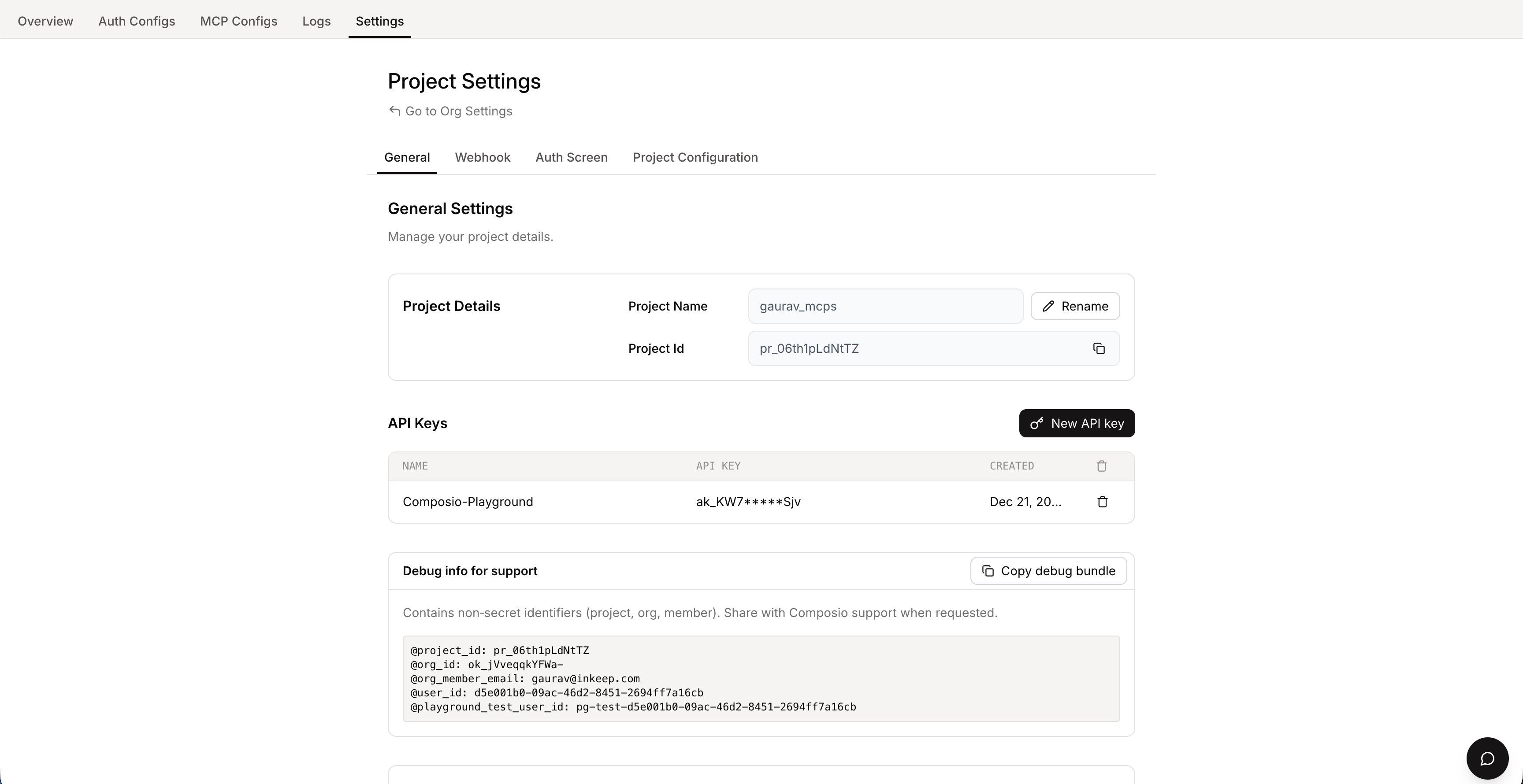 Copy your Composio API key from the Settings tab.